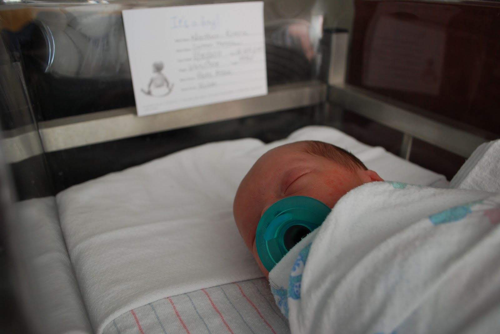 we spent the first hour of the boy's life with him in the nursery. he had an IMMEDIATE sucking reflex and since his head was super sore, the nurses gave him a pacifier to help him self-soothe. it worked immediately. he ate a full meal and got a bath before being wheeled into our room.